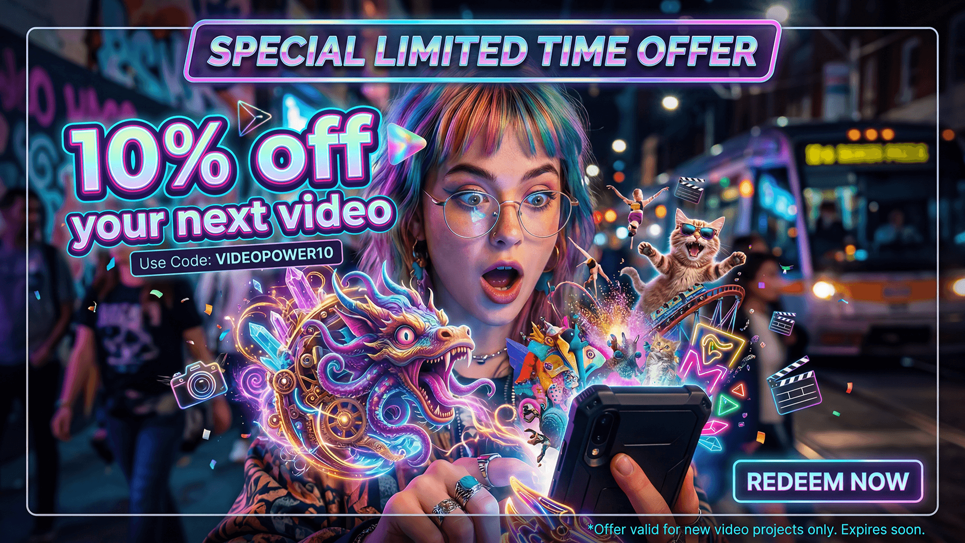 TERMS AND CONDITIONS. Get 10% off your next video booking with Pearldrop Ltd. Offer valid for new enquiries only and must be claimed by quoting VIDEOPOWER10 via pearldrop.com/winning at the point of enquiry. Discount applies to the first accepted quotation only. One discount per customer. Cannot be used in conjunction with any other offer, discount or promotion. Offer is subject to availability. Pearldrop Ltd reserves the right to withdraw or amend this offer at any time.